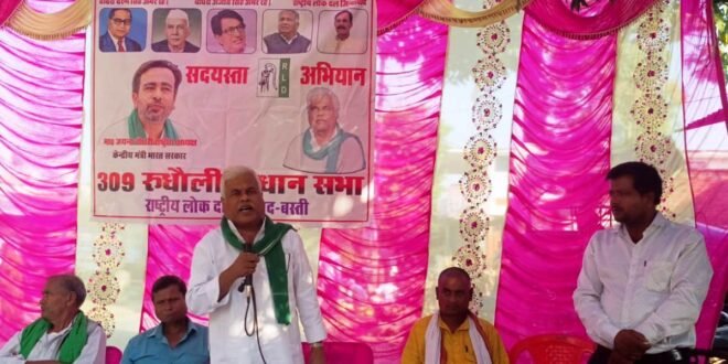 बस्ती। रविवार को राष्ट्रीय लोक दल द्वारा रुधौली विधानसभा क्षेत्र के छितही खुर्द बाजार में सभा का आयोजन ग्राम प्रधान अनिल चौधरी के संयोजन में आयोजित किया। साऊंघाट विकास खण्ड क्षेत्र में आयोजित सभा को मुख्य अतिथि के रूप में सम्बोधित करते हुये प्रदेश महासचिव अरुणेन्द्र पटेल ने कहा कि रालोद निरन्तर किसानांें, नौजवानों के हितो के सवाल को लेकर केन्द्र से लेकर उत्तर प्रदेश की सरकार से नीतिगत नीतियो को लागू करा रही है। कहा कि रालोद की मजबूती से ही जय जवान, जय किसान का संकल्प साकार होगा। कहा कि आगामी 30 अक्टूबर को लौह पुरूष सरदार बल्लभ भाई पटेल के जयन्ती अवसर पर राष्ट्रीय अध्यक्ष और केन्द्रीय मंत्री जयन्त चौधरी बस्ती आ रहे हैं। वाल्टरगंज में आयोजित कार्यक्रम में सक्रिय भागीदारी होनी चाहिये।